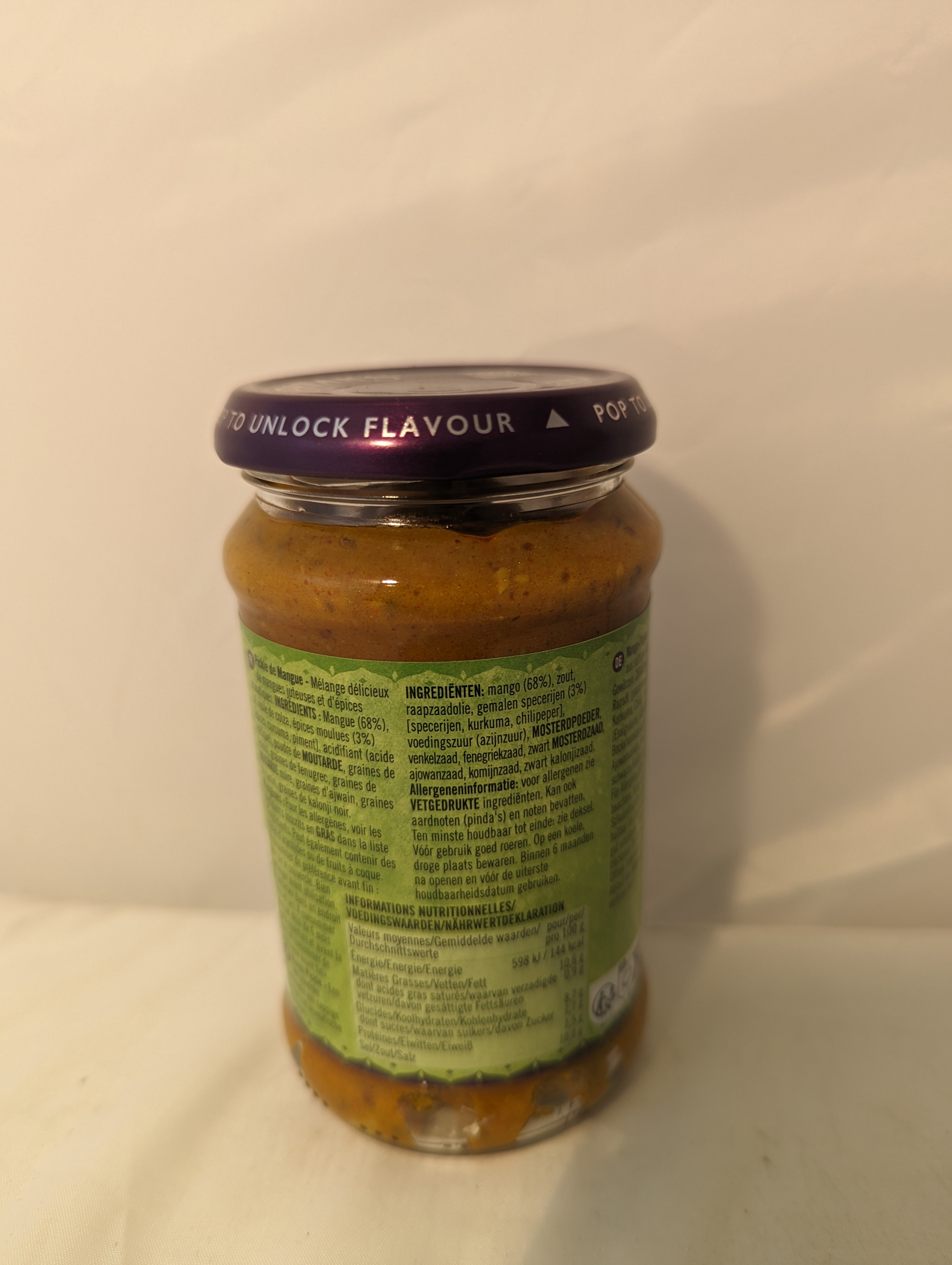 Mangos ( 68% ), Salz, Rapsöl, gemahlene Gewürze ( 3% ) ( Gewürze, Kurkuma, Chili ), Säuerungsmittel ( Essigsäure, ),